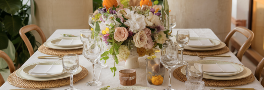 - Le linge de table : nappes, serviettes, chemins de table… Tout doit être en harmonie avec le reste de la déco.